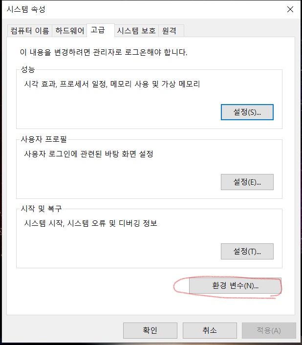 9) 시스템 속성 -> 고급 탭 -> 환경 변수를 클릭합니다.