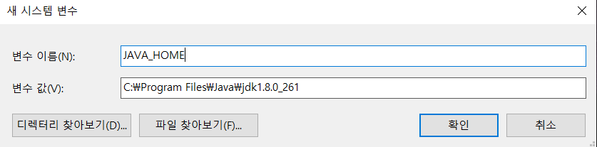 저는 C:\Program Files\JAVA\jdk1.8.0_261이라 이렇게 잡아주었습니다.
