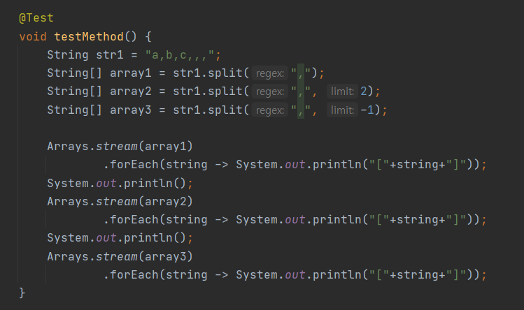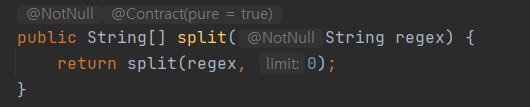 즉, 분해 후 얻고자 하는 String[]의 크기라고 보면 된다. 다만, 분해하고자 하는 요소의 개수와 같거나 클 경우는 배열의 개수만큼 String[]을 돌려주지만, 요소의 개수보다 작을 경우 지정한 숫자(limit 값)만큼의 String[]으로 돌려준다.