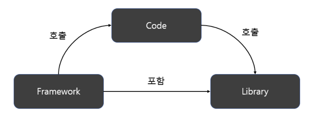 위의 그림을 보면 프레임워크는 코드를 호출하고 있고 그 코드에서 라이브러리를 호출하고 있죠?